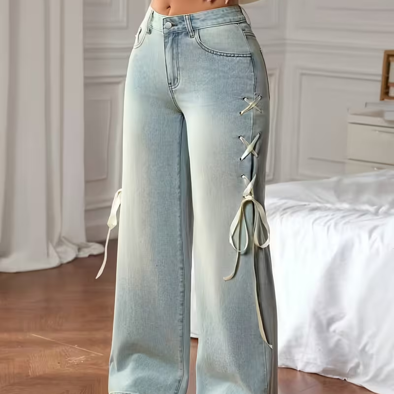 Women’s Loose-Fit Wide-Leg Flared Jeans with Bow Tie